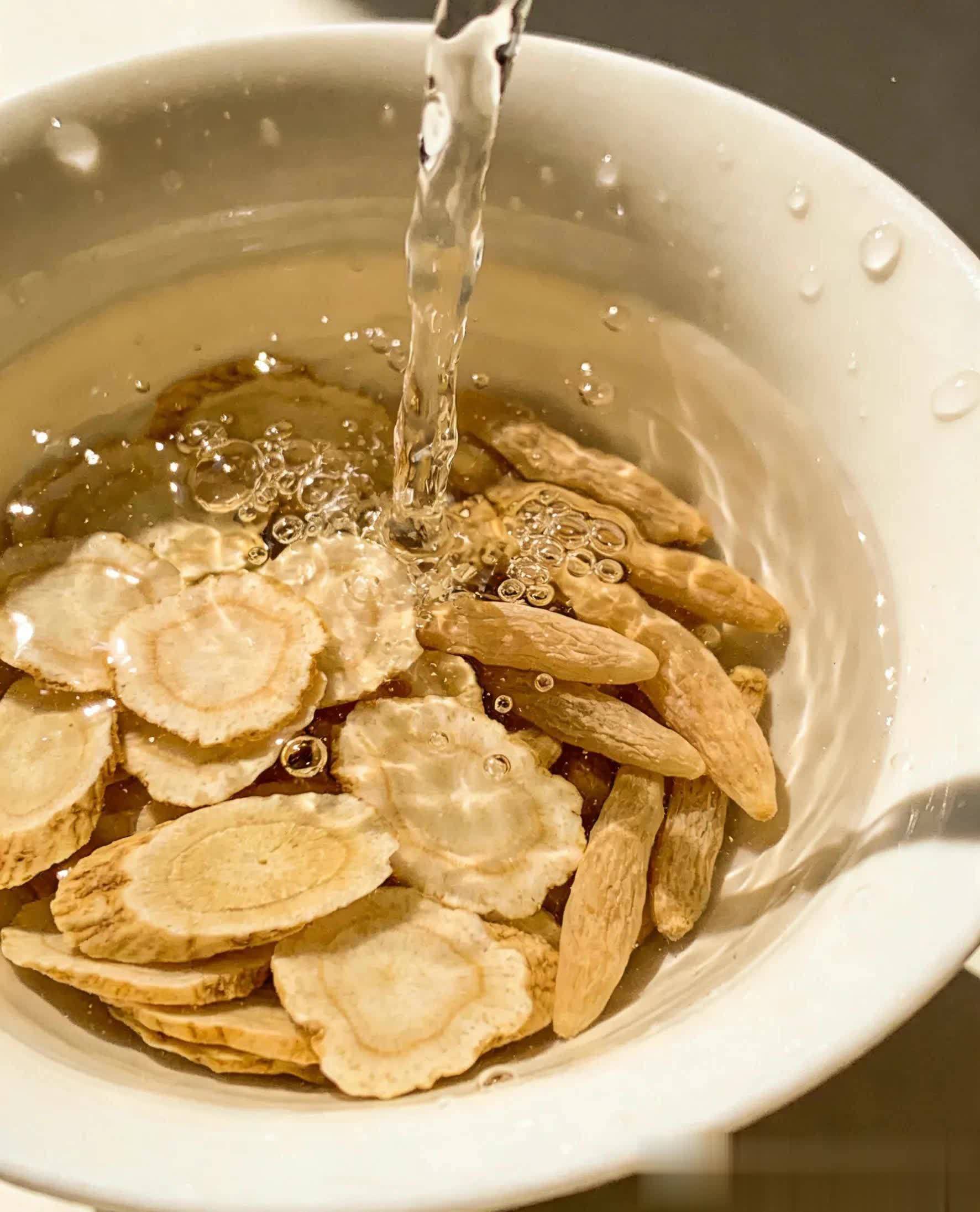 1. 麦冬快速冲洗去浮尘,西洋参片备用