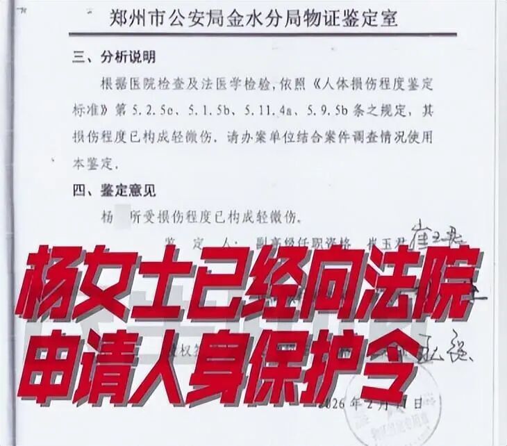 “长达20分钟的家暴,如果不是9岁的女儿打110,我不知道会把我打成什么样,医生说我头上的伤再往下3厘米可能就没命了!”当即,杨女士去做了伤情鉴定,郑州市公安局金水分局出具的鉴定意见显示:杨女士所受损伤程度已构成轻微伤。希望能和丈夫好聚好散,不要伤及孩子。